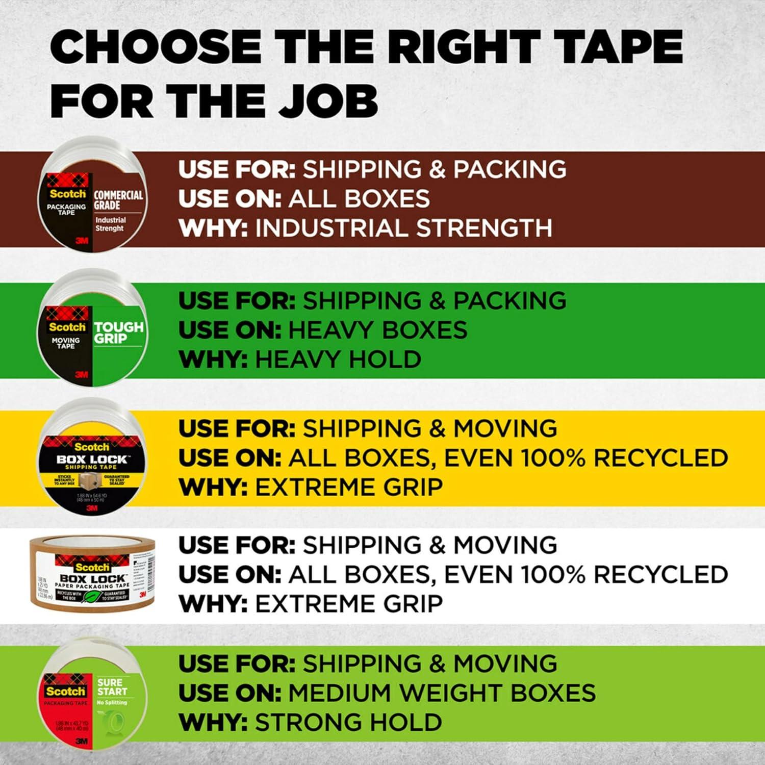 Mailroom professionals need the super strong, reliable seal of Scotch Commercial Grade Shipping Packaging Tape. Heavy duty, hot melt, solvent free adhesive combined with polypropylene backing keeps out moisture, dust and dirt and assures reliable closures. Designed for industrial use, one strip at a time instead of many layers seals your package securely. Resistance to splitting and slivering saves time, while a release coating makes unwind easy. Tough jobs demand the right tools. For packaging boxes, Scotch Commercial Grade Shipping Packaging Tape is the best tool for jobs that demand heavy duty performance.